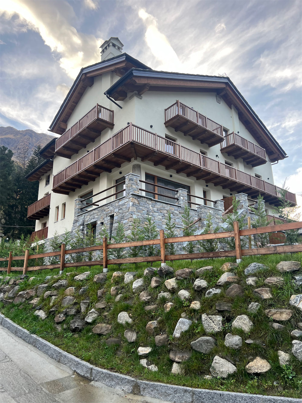 Prospettiva dal basso di un edificio a tre piani intonacato con lunghi ballatoi in legno. In primo piano una massicciata, con pietre a vista intervallate da erba, che rinforza e sostiene una staccionata in legno a doppie traverse orizzontali e la zona erbosa. Il cielo è nuvoloso. Sullo sfondo conifere e il pendio di una montagna.
